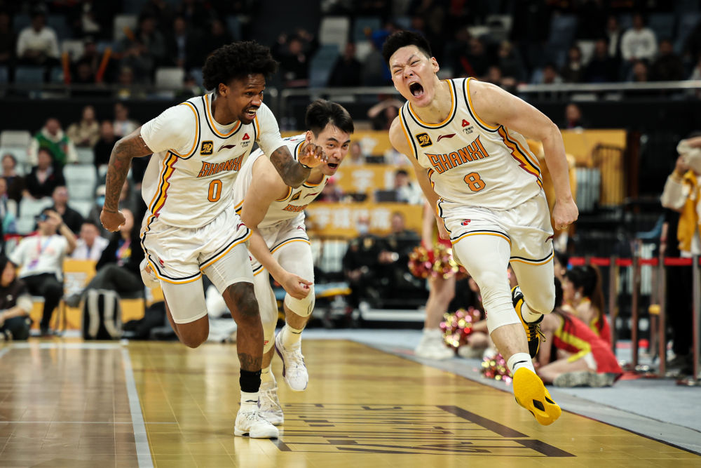 3月5日,山西汾酒隊球員張寧(右)命中絕殺球后慶祝。新華社記者 江漢 攝