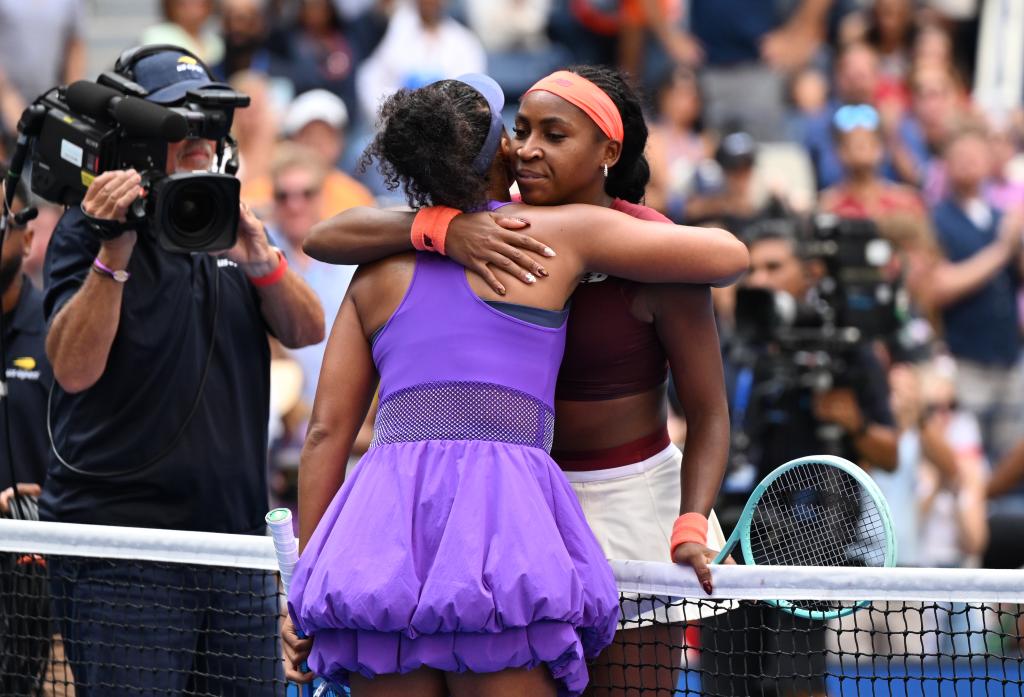9月1日,高芙(右)和大坂直美在比賽后擁抱致意。新華社記者 李睿 攝 這場“重頭戲”的一邊是四屆大滿貫冠軍、曾兩次在美網(wǎng)捧杯的前世界第一大坂直美;另一邊是2023年美網(wǎng)冠軍,今年又剛剛在法網(wǎng)拿到個(gè)人第二個(gè)大滿貫冠軍的美國女單新生代領(lǐng)軍人物高芙。