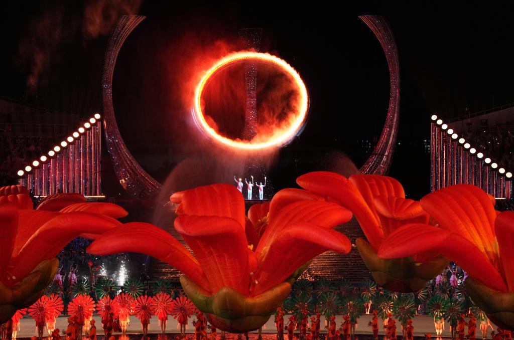 新華社廣州11月10日電(記者王浩明、趙紫羽、田宇)9日晚,廣東奧林匹克體育中心,十五運(yùn)會(huì)的開幕式在這里舉行,當(dāng)十五運(yùn)會(huì)主火炬塔“天海之冠”被三地健兒共同點(diǎn)亮那一剎,燈火輝煌,掌聲雷動(dòng)。