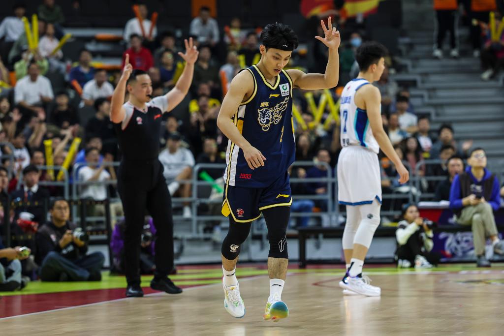廣東隊(duì)球員徐杰(中)在比賽中投進(jìn)三分球后慶祝。新華社發(fā)(鄭家雄攝)