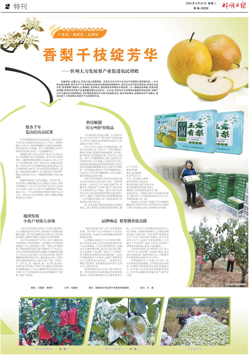 時值仲秋,白露已過,忻州大地上梨香陣陣。忻府區(qū)蘭村鄉(xiāng)河習(xí)頭村的千畝梨園已是碩果壓枝,一片豐收在望的景象;原平市子干鄉(xiāng)東南賈村的標(biāo)準(zhǔn)化梨園基地規(guī)整有序,現(xiàn)代化農(nóng)業(yè)氣息撲面而來;忻府區(qū)北趙村的“老李君睞”梨園中,紅梨滿枝,色澤鮮亮,展現(xiàn)著特色種植的豐碩成果。這一幅幅金秋畫卷,既是自然的饋贈,更是忻州市梨產(chǎn)業(yè)高質(zhì)量發(fā)展的生動見證。近年來,忻州市充分發(fā)揮自然稟賦和傳統(tǒng)優(yōu)勢,將梨產(chǎn)業(yè)作為推動農(nóng)業(yè)提質(zhì)增效、農(nóng)民增收致富和鄉(xiāng)村振興的重要支柱,通過科技驅(qū)動、品牌建設(shè)和產(chǎn)業(yè)融合,穩(wěn)步實現(xiàn)了從傳統(tǒng)果業(yè)向現(xiàn)代產(chǎn)業(yè)的轉(zhuǎn)型升級。