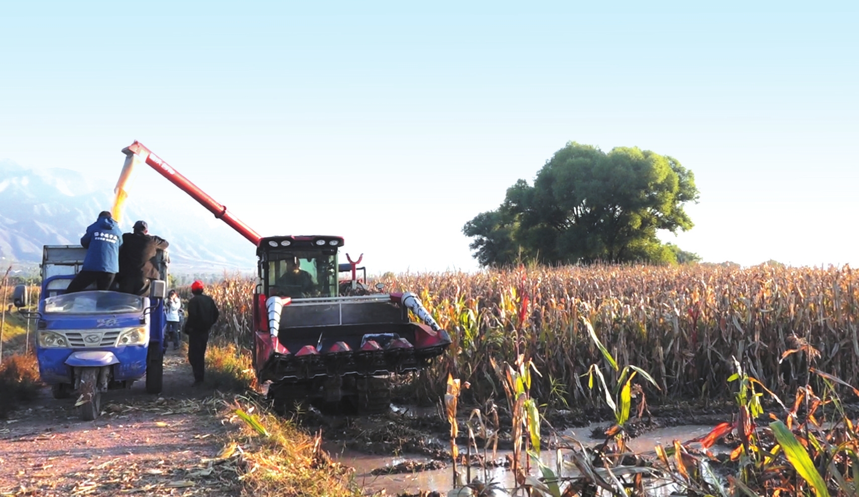 “突突”的引擎聲在濕漉漉的玉米地里轟鳴,來(lái)回穿梭中,金色的玉米在“吞吐”下脫粒,隨后如溪流般源源不斷地傾瀉而出,精準(zhǔn)地落入一旁等候的運(yùn)輸車廂內(nèi),瞬間堆起了一座座豐收的小山。