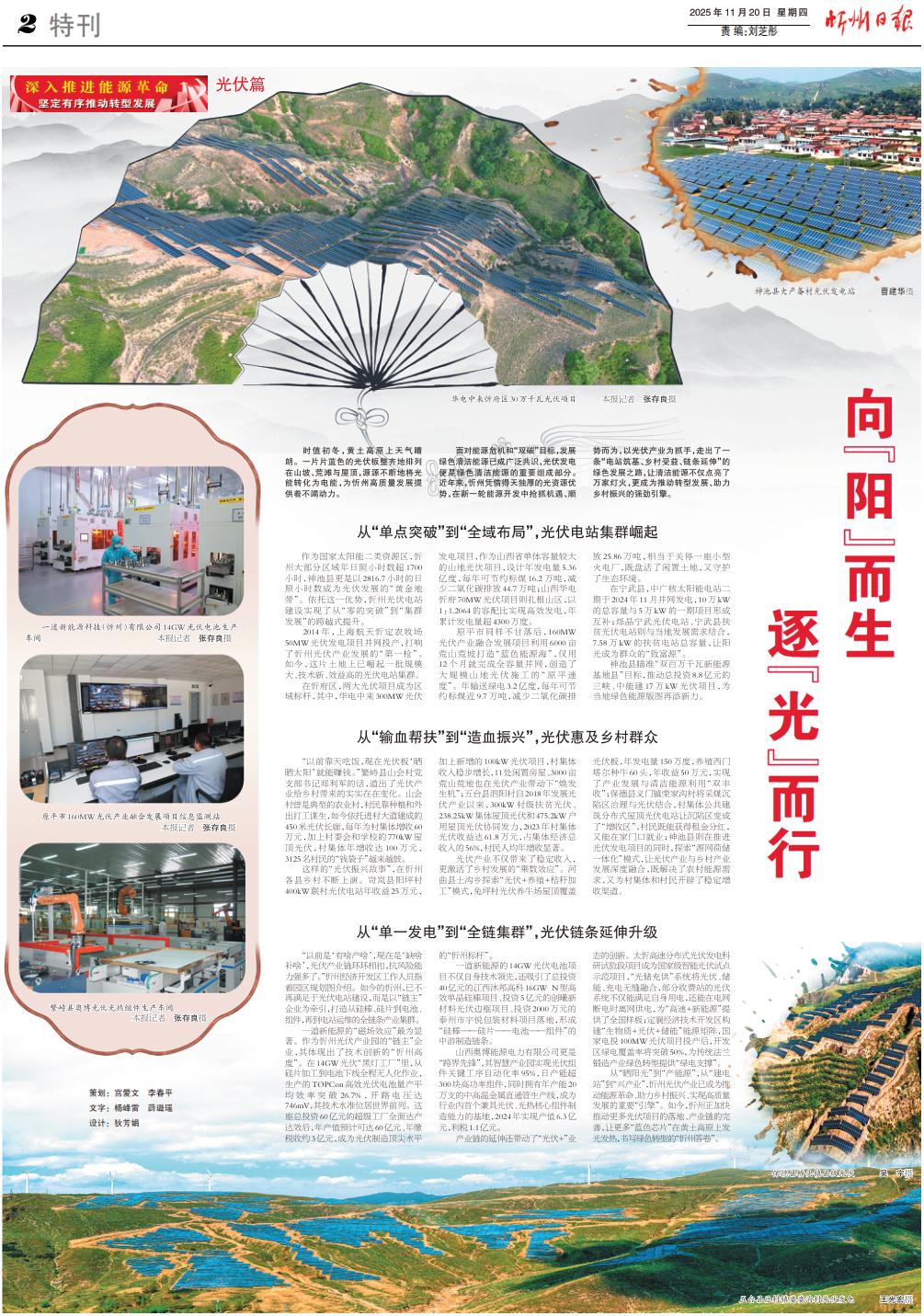從“曬陽光”到“產(chǎn)能源”,從“建電站”到“興產(chǎn)業(yè)”,忻州光伏產(chǎn)業(yè)已成為推動(dòng)能源革命、助力鄉(xiāng)村振興、實(shí)現(xiàn)高質(zhì)量發(fā)展的重要“引擎”。如今,忻州正加快推動(dòng)更多光伏項(xiàng)目的落地、產(chǎn)業(yè)鏈的完善,讓更多“藍(lán)色芯片”在黃土高原上發(fā)光發(fā)熱,書寫綠色轉(zhuǎn)型的“忻州答卷”。