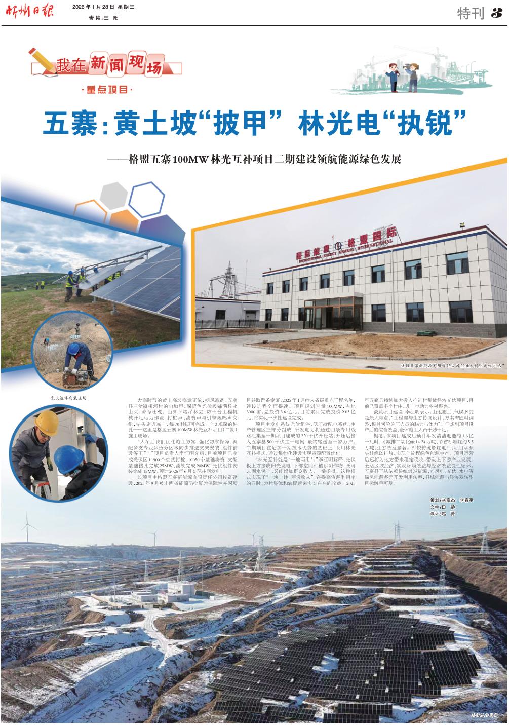 該項目由格盟五寨新能源有限責(zé)任公司投資建設(shè),2023年9月被山西省能源局批復(fù)為保障性并網(wǎng)項目并取得備案證,2025年1月納入省級重點工程名單,建設(shè)進程全面提速。項目規(guī)劃容量100MW,占地3000畝,總投資3.6億元,目前累計完成投資2.03億元,將實現(xiàn)一次性建設(shè)完成。