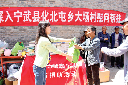據(jù)悉,大場村距離寧武縣城約40 公里,由于地處山區(qū),經(jīng)濟(jì)和交通狀況較差。自2009 年以來,市郵政分公司每年指派專人在該村定點(diǎn)幫扶,募集款物捐助困難群眾,受到了當(dāng)?shù)卣腿罕姷囊恢潞迷u。圖為捐贈現(xiàn)場。(魯明強(qiáng) 趙崇凱 攝影報道)