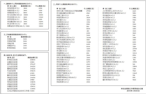 自2018年12月10日市委、市政府辦公廳發(fā)出《關(guān)于開展“送溫暖、獻(xiàn)愛心”社會捐助活動的通知》(忻辦字【2018】86號)以來,市四大班子領(lǐng)導(dǎo)率先垂范,各縣(市、區(qū))、各單位高度重視,緊急部署,廣大干部職工積極響應(yīng),踴躍捐款,又一次掀起了“送溫暖、獻(xiàn)愛心”社會捐助活動的高潮。截至2019年4月25日下午4時(shí),全市累計(jì)接收捐款2802113元,其中市直79個單位組織參加了此次捐助活動,共計(jì)捐款585095元;各縣(市、區(qū))接收捐款2217018元,為解決我市困難群眾的生產(chǎn)、生活問題,助推脫貧攻堅(jiān)起到了積極的作用?,F(xiàn)將活動進(jìn)展情況公告如下(市直單位以捐助時(shí)間先后為序):