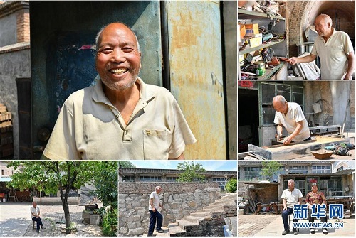 韓忠岐,男,1949年出生,山西省長治市潞城區(qū)垂陽村人,1976年起擔(dān)任村干部。從小熱愛學(xué)習(xí)的韓忠岐對鄉(xiāng)村發(fā)展有自己獨特的想法,他鼓勵村民們學(xué)習(xí)技能,在農(nóng)閑時“組團(tuán)”外出打工,農(nóng)忙時鄰里互幫互助,曾經(jīng)貧窮的垂陽村在他的帶領(lǐng)下慢慢富裕起來。退休后,閑不下來的韓忠岐自學(xué)打鐵、電焊技能,現(xiàn)在成了鄉(xiāng)里小有名氣的鐵匠,經(jīng)常為貧困戶開展技術(shù)培訓(xùn)。 左上:韓忠岐肖像;右上:韓忠岐在挑選工具;右中:韓忠岐在制作一個鐵皮抽屜;右下:韓忠岐和老伴坐在院子里;下中:韓忠岐去鄰居家串門;下左:韓忠岐在院子里乘涼(拼版照片,6月18日攝)。 地處晉東南的山西省長治市,位于由太行山、太岳山環(huán)繞而成的上黨盆地中。在群山中、崖壁上,許多村莊自然條件惡劣,基礎(chǔ)設(shè)施落后,脫貧致富是大山深處人們的迫切心愿。 近年來,一場場脫貧攻堅戰(zhàn),在一個個深山村打響。政府全力探索脫貧路徑的同時,山區(qū)百姓因地制宜,靠自己的雙手和智慧走上致富路,交出了一份扎實的脫貧答卷。 記者在太行山、太岳山一路尋訪,記錄下多位70歲老人的生活。這些共和國的同齡人,親歷了山鄉(xiāng)的巨變,見證著長治山區(qū)脫貧攻堅偉大工程的一步步推進(jìn)。 新華社記者 曹陽 攝