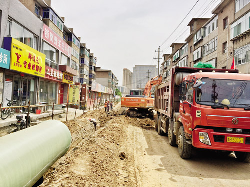 因為氣巷南巷路面較窄,地下雨水和污水管線的施工采用的是同槽開挖下埋。溝槽深度4米、寬度3.5米,雨水管線采用直徑分別為0.8米和1.2米的玻璃夾砂鋼管,污水管線采用直徑為50厘米的玻璃夾砂鋼管。為了安全,施工隊將開槽、下管和回填同步進行。