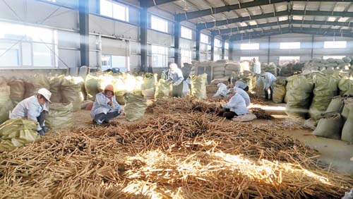 當(dāng)?shù)剞r(nóng)民在產(chǎn)業(yè)孵化園倉房內(nèi)分揀黃芪藥材
