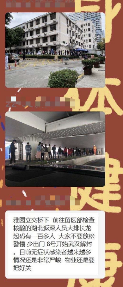 “雅園立交橋下,前往留醫(yī)部檢查核酸的湖北返深人員大排長龍,起碼有一百人,大家不要放松警惕,少出門?!?日,這段文字和兩張大排長龍的圖片在網(wǎng)上流傳。記者9日從深圳市人民醫(yī)院獲悉,該情況并不屬實(shí)。一份核酸取樣平均時(shí)間為數(shù)秒鐘,醫(yī)院核酸檢測排隊(duì)患者一般在10~50人之間,因?yàn)樾枰3?米隔離,隊(duì)伍會(huì)比較長,但也未超過百米,更不存在排出醫(yī)院大門外或雅園立交橋下,市民無需緊張。