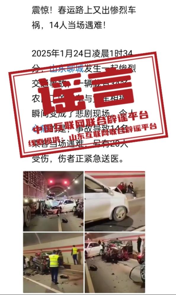 真相:近日,有網(wǎng)民在網(wǎng)絡(luò)平臺(tái)發(fā)布一則“山東聊城一隧道內(nèi)發(fā)生多車相撞”的信息,稱“現(xiàn)場(chǎng)多車發(fā)生嚴(yán)重碰撞,場(chǎng)面慘烈,群眾滯留”,引發(fā)關(guān)注。經(jīng)當(dāng)?shù)鼐胶藢?shí),山東省聊城市從未發(fā)生過類似交通事故,該信息內(nèi)容純屬虛假編造。經(jīng)查,網(wǎng)民褚某某和韓某為博取關(guān)注、吸引流量,將外省市發(fā)生交通事故的圖片視頻移花接木,稱“聊城發(fā)生交通事故”并憑空捏造傷亡人數(shù),造成不良影響。目前,二人已被公安機(jī)關(guān)依法打擊處理。(來(lái)源:山東互聯(lián)網(wǎng)聯(lián)合辟謠平臺(tái)、聊城市網(wǎng)上辟謠平臺(tái))