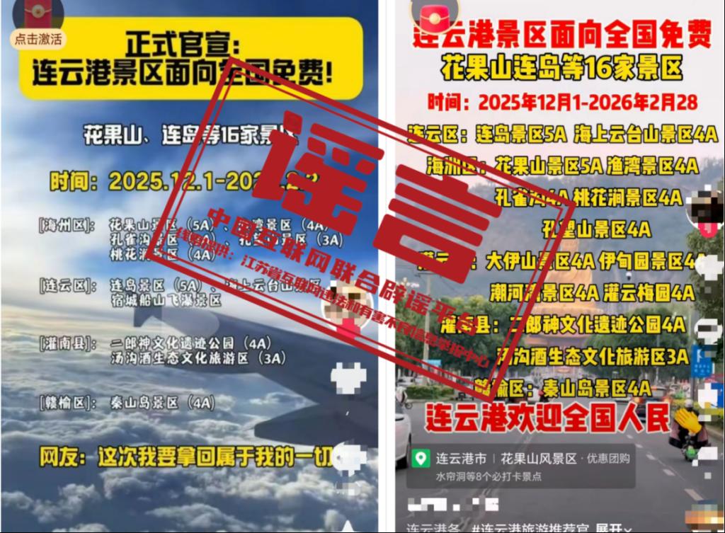 謠言:江蘇連云港景區(qū)“2025年12月1日至2026年2月28日面向全國免費”?