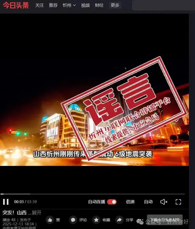 2025年12月13日,有網(wǎng)民發(fā)布“突發(fā)!山西忻州遭遇6級(jí)地震,多地震感強(qiáng)烈”等不實(shí)信息,引發(fā)網(wǎng)民關(guān)注。