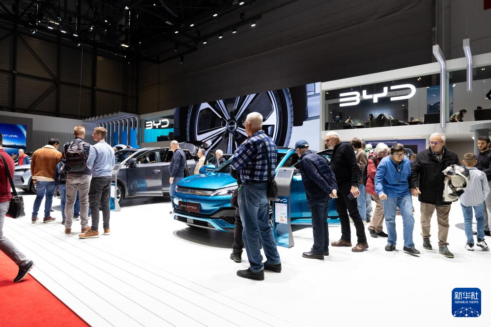 這是2月28日在瑞士日內(nèi)瓦舉行的2024年日內(nèi)瓦國(guó)際車展上拍攝的比亞迪展臺(tái)。新華社記者孟鼎博 攝