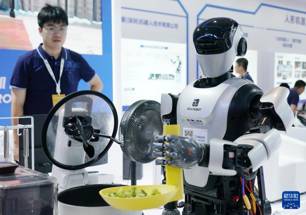 一款人形機器人在2024世界機器人大會上炒菜。新華社記者 張晨霖 攝