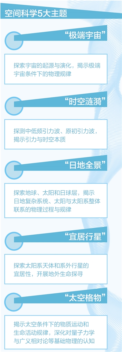 “太空格物”主題。主要是揭示太空條件下的物質(zhì)運動和生命活動規(guī)律,深化對量子力學(xué)與廣義相對論等基礎(chǔ)物理的認(rèn)知。優(yōu)先發(fā)展方向包括微重力科學(xué)、量子力學(xué)與廣義相對論、空間生命科學(xué)等。