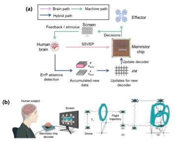 (a)腦-憶阻器交互式更新框架;(b)基于憶阻器腦電解碼的實(shí)時腦控?zé)o人機(jī)飛行。(聯(lián)合研究團(tuán)隊(duì)供圖)