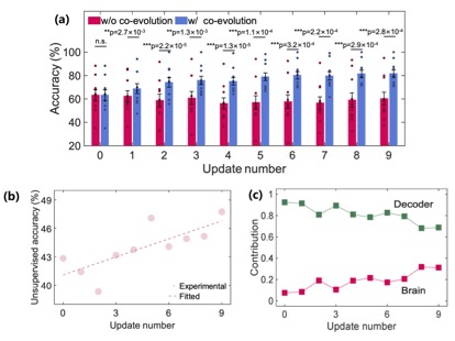 (a)協(xié)同演進(jìn)腦機(jī)解碼正確率較初始狀態(tài)提高20%;(b)任務(wù)相關(guān)腦電特征發(fā)生正向演化;(c)腦與憶阻器解碼器實(shí)現(xiàn)互適應(yīng)。(聯(lián)合研究團(tuán)隊(duì)供圖)