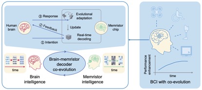 天津大學(xué)與清華大學(xué)的聯(lián)合研究團(tuán)隊(duì)針對這一難題,發(fā)現(xiàn)腦電信號的非平穩(wěn)特性與任務(wù)腦電演變密切相關(guān)?;诖?,他們創(chuàng)新性地提出了“雙環(huán)路腦機(jī)協(xié)同演進(jìn)框架”,并通過憶阻器神經(jīng)形態(tài)器件加以實(shí)現(xiàn)。在“雙環(huán)路”框架下,腦與機(jī)的學(xué)習(xí)環(huán)路相互協(xié)同,共同促進(jìn)系統(tǒng)性能的提升。