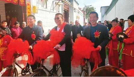 幾天前,這首“騎單車”歌曲里的情景,在太原市小店區(qū)小店街道杜家寨社區(qū)的一場婚禮上再現(xiàn)——新郎幸福地蹬著單車,后座上,美麗的新娘穿著紅色婚紗,甜蜜地靠在新郎背上,他們穿過社區(qū),在沿途眾多鄉(xiāng)鄰、親友的喝彩聲、祝福聲中,舉行了一場特別的單車婚禮。
