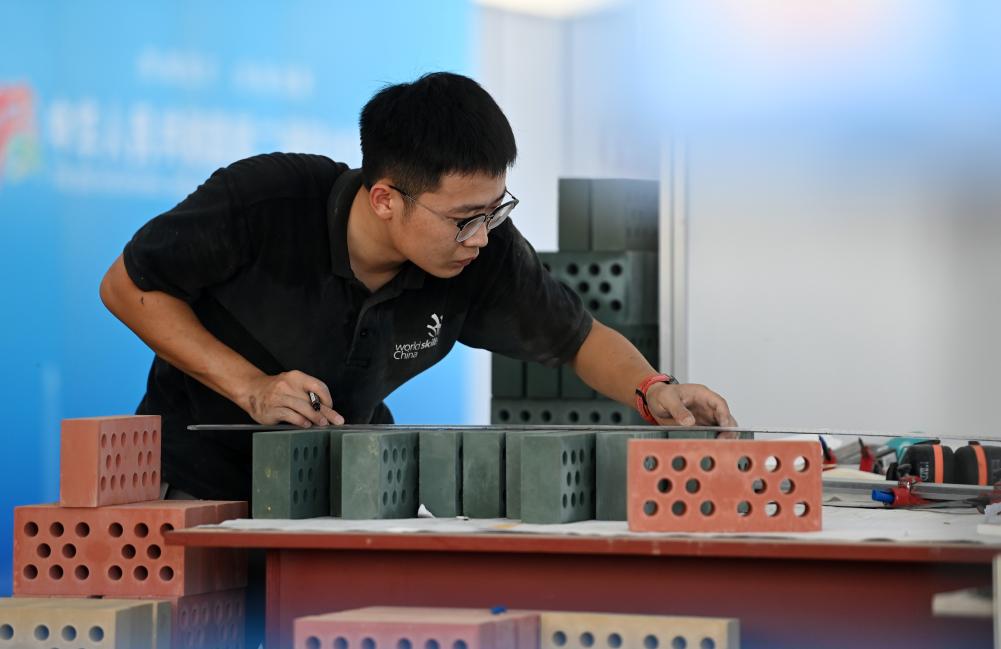 2023年9月17日,在國家會展中心(天津)舉辦的中華人民共和國第二屆職業(yè)技能大賽進入第二天,參賽選手在參加砌筑項目比賽。新華社記者 趙子碩 攝
