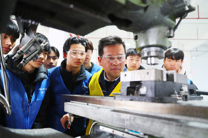 2024年1月9日,在湖南省永州市新田縣產(chǎn)業(yè)開發(fā)區(qū)永州群翰科技有限公司車間,新田縣職業(yè)中等專業(yè)學(xué)校學(xué)生在工廠師傅的指導(dǎo)下學(xué)習(xí)機(jī)床操作技術(shù)。近年來,該校聯(lián)合企業(yè)開展“產(chǎn)教融合、校企辦學(xué)”模式,助推就業(yè)創(chuàng)業(yè)。新華社發(fā)(劉貴雄 攝)