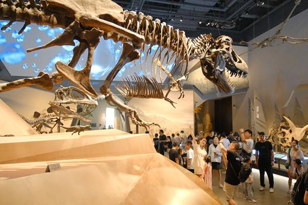 8月21日,浙江湖州,游客在恐龍館內(nèi)參觀。暑假進入尾聲,位于湖州市安吉縣的浙江自然博物院熱度不減。視覺中國供圖