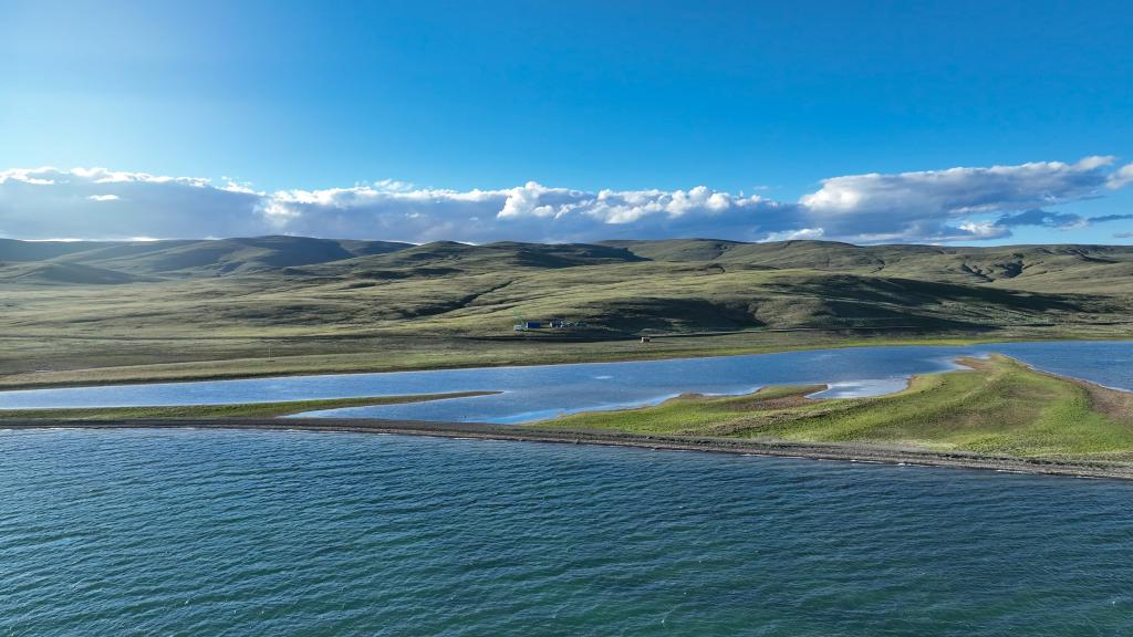 7月25日拍攝的尕日塘秦刻石所在地青海省果洛藏族自治州瑪多縣扎陵湖北岸(無人機照片)。新華社記者 杜笑微 攝