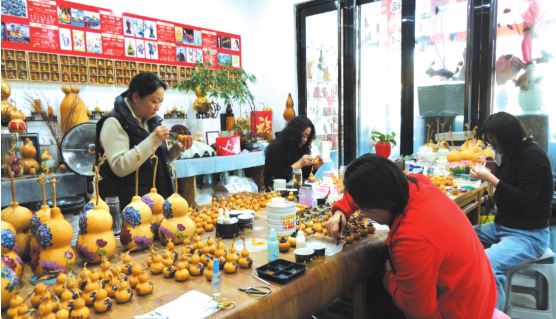 在工作室內(nèi),手工藝人侯晉麗正專注地為葫蘆彩繪。她介紹說:“我們制作的每一件葫蘆雕刻作品都需要多重工序,從篩選葫蘆到刮皮、晾曬、浸泡、拋光,再到依形構(gòu)思、打稿設(shè)計,最后經(jīng)過線刻、浮雕等精雕細琢與上色收尾,每一個工序都考驗著我們的耐心與功力。”