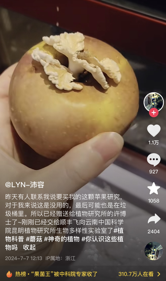 一顆“長菌蘋果”的奇幻漂流,引發(fā)了媒體聚焦。據(jù)潮新聞報(bào)道,上個月末,浙江梅雨不斷。浙江德清的鄧小姐發(fā)現(xiàn),家里放了一個多月的蘋果上,竟長出了白色的蘑菇。她在抖音上曬出圖片,登上抖音熱榜,那顆“長菌蘋果”被網(wǎng)友戲稱為“果菌王”。