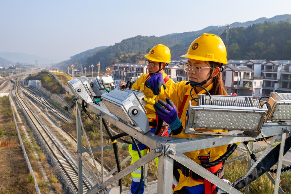 3月7日,中國(guó)鐵路昆明局集團(tuán)有限公司“00后”女電工王華欽(右一)在中老鐵路寧洱站貨運(yùn)場(chǎng)檢修燈塔(無(wú)人機(jī)照片)。新華社發(fā)(殷學(xué)合 攝)