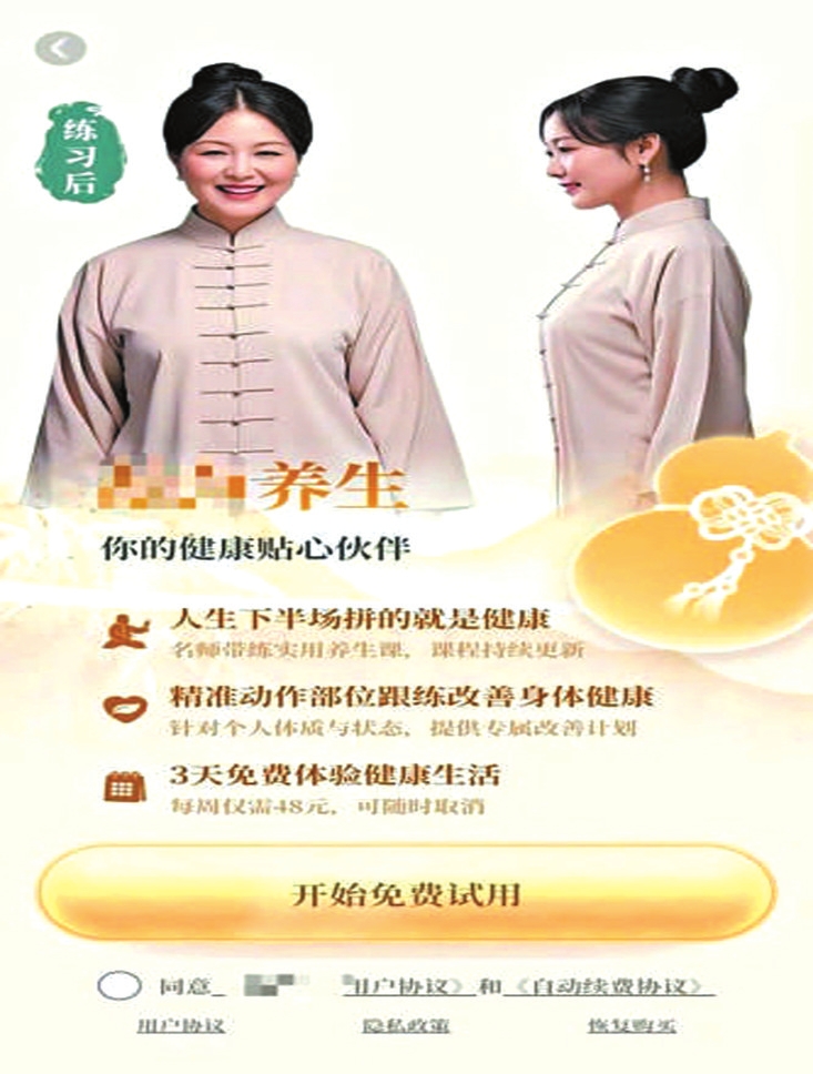還有些App則更加離譜,下載完成后,點(diǎn)進(jìn)去的第一步就是要購買會(huì)員,之后才能正常使用。但在購買流程上,平臺(tái)卻耍起了花招。比如一款提供“養(yǎng)生指導(dǎo)服務(wù)”的App,頁面上會(huì)有一個(gè)大大的按鈕,寫著“開始免費(fèi)試用”。但在按鈕的旁邊,卻有一行非常不起眼的小字:“每周僅需48元,可隨時(shí)取消?!倍坏┯脩酎c(diǎn)擊開始試用,系統(tǒng)就會(huì)跳轉(zhuǎn)到自動(dòng)續(xù)費(fèi)的開通界面。如果是辨別能力差的老人,可能還以為是在填寫什么注冊(cè)信息。