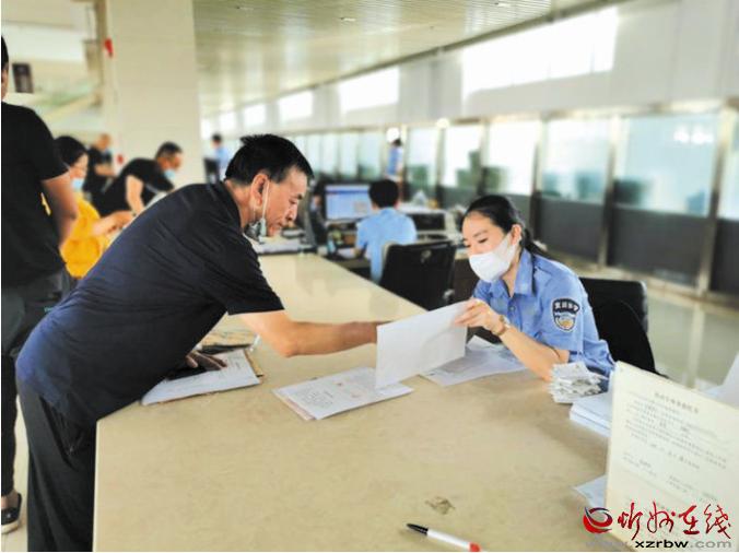 近年來(lái),市車(chē)輛管理所積極創(chuàng)新管理方式,提高工作效率和服務(wù)質(zhì)量,努力通過(guò)車(chē)管所營(yíng)業(yè)廳這個(gè)小“窗口”,為市民提供一流的車(chē)輛管理服務(wù)。圖為工作人員在為客戶劉先生辦理業(yè)務(wù)。王金龍 攝