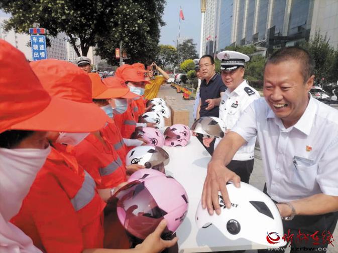 今年是我市創(chuàng)建全國(guó)文明城市的決戰(zhàn)決勝年,廣大環(huán)衛(wèi)工人一直默默奮斗在崗位上,為我市創(chuàng)文不斷努力。市公安局交警支隊(duì)始終牽掛著奮戰(zhàn)在基層一線的環(huán)衛(wèi)工人,支隊(duì)以此次贈(zèng)送頭盔活動(dòng)為契機(jī),持續(xù)關(guān)心關(guān)愛環(huán)衛(wèi)工人的生命安全和身體健康。市公安局交警支隊(duì)負(fù)責(zé)人表示:“環(huán)衛(wèi)工人大多騎著電動(dòng)三輪車或人力保潔車穿梭在大街小巷,機(jī)動(dòng)車道是他們的主要作業(yè)區(qū)之一,佩戴安全頭盔,可以大大增加他們的安全系數(shù)。同時(shí),環(huán)衛(wèi)等重點(diǎn)行業(yè)的示范引領(lǐng)作用,將有力帶動(dòng)市民遵紀(jì)守法、安全出行,為文明城市創(chuàng)建打造一道亮麗的風(fēng)景線?!眻D為捐贈(zèng)活動(dòng)現(xiàn)場(chǎng)。張志遠(yuǎn) 攝影報(bào)道