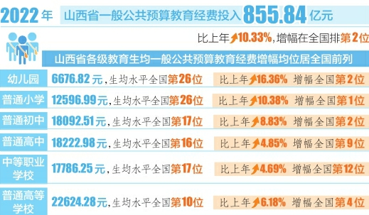 山西日報訊(記者任志霞)日前,教育部、國家統(tǒng)計局、財政部發(fā)布了2022年全國教育經(jīng)費執(zhí)行情況統(tǒng)計公告(以下簡稱統(tǒng)計公告)。統(tǒng)計公告顯示,2022年山西省一般公共預算教育經(jīng)費投入855.84億元,比上年增長10.33%,增幅在全國排第2位。
