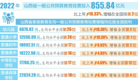 本報(bào)訊(記者任志霞)日前,教育部、國家統(tǒng)計(jì)局、財(cái)政部發(fā)布了2022年全國教育經(jīng)費(fèi)執(zhí)行情況統(tǒng)計(jì)公告(以下簡(jiǎn)稱統(tǒng)計(jì)公告)。統(tǒng)計(jì)公告顯示,2022年山西省一般公共預(yù)算教育經(jīng)費(fèi)投入855.84億元,比上年增長10.33%,增幅在全國排第2位。