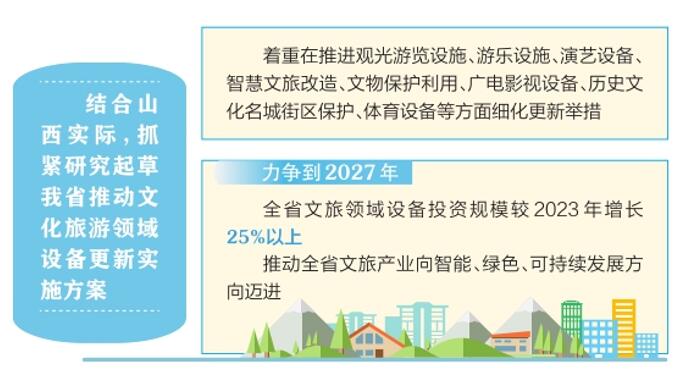 系統(tǒng)推進(jìn),夯實(shí)重點(diǎn)任務(wù)。結(jié)合山西實(shí)際,抓緊研究起草我省推動(dòng)文化旅游領(lǐng)域設(shè)備更新實(shí)施方案,著重在推進(jìn)觀光游覽設(shè)施、游樂設(shè)施、演藝設(shè)備、智慧文旅改造、文物保護(hù)利用、廣電影視設(shè)備、歷史文化名城街區(qū)保護(hù)、體育設(shè)備等方面細(xì)化更新舉措,明確更新提升重點(diǎn),力爭(zhēng)到2027年,全省文旅領(lǐng)域設(shè)備投資規(guī)模較2023年增長(zhǎng)25%以上,推動(dòng)全省文旅產(chǎn)業(yè)向智能、綠色、可持續(xù)發(fā)展方向邁進(jìn)。