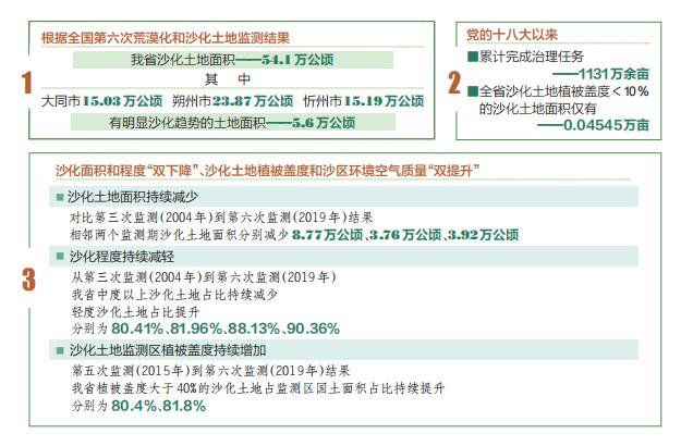 荒漠化是影響人類生存和發(fā)展的全球性重大生態(tài)問題。我省晉西北和晉北地區(qū)是全國荒漠化監(jiān)測與防治的重點地區(qū)之一。經(jīng)過長期積極探索,不斷創(chuàng)新機制和科學(xué)防沙治沙,我省實現(xiàn)了沙化面積和程度“雙下降”、沙化土地植被蓋度和沙區(qū)環(huán)境空氣質(zhì)量“雙提升”的實際成效。
