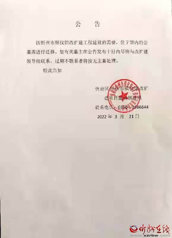 因忻州市殯儀館改擴(kuò)建工程建設(shè)的需要,位于館內(nèi)的公墓需進(jìn)行遷移(不涉及骨灰寄存)。望有關(guān)墓主在公告發(fā)布十日內(nèi)盡快與改擴(kuò)建領(lǐng)導(dǎo)組聯(lián)系。過(guò)期不聯(lián)系者將按無(wú)主墓處理。