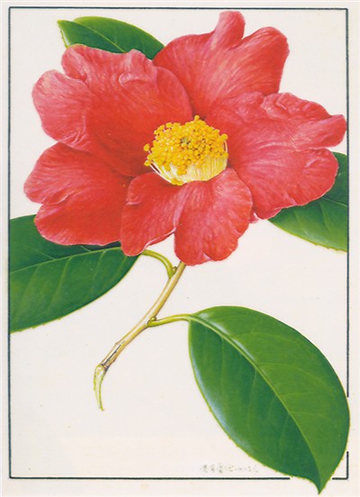 浙江山茶花 紅色花瓣明艷動人,皺褶感栩栩如生。倒卵形花瓣頂端的2裂、深綠葉片發(fā)亮的革質(zhì)感以及邊緣的鋸齒都得到完整表現(xiàn),不愧是經(jīng)典之作。馮晉庸繪