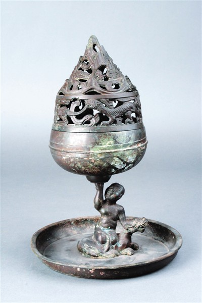 西漢鎏銀騎獸人物博山爐,河北博物館藏。1968年,河北滿城陵山二號(hào)漢墓發(fā)掘出土。在西漢,人們喜愛(ài)焚香熏煙,來(lái)驅(qū)瘟防疫,養(yǎng)生祛病。