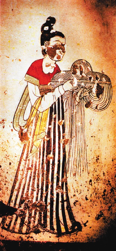 唐燕妃墓捧帷帽侍女壁畫,昭陵博物館藏。1990年,唐太宗的妃子燕氏的墓室被清理出來(lái),墓室壁畫中,宮女手中所捧的帷帽垂掛著一圈長(zhǎng)絲穗,形成一道薄幕,有一定衛(wèi)生防護(hù)功能。
