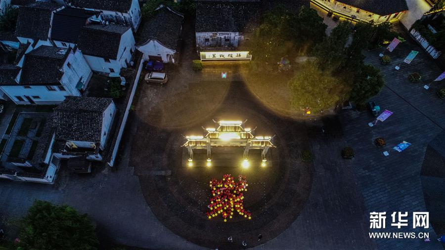 9月29日,龍門鎮(zhèn)文明志愿幫幫團(tuán)的志愿者提著花燈排成一個(gè)“家”字,慶祝古鎮(zhèn)廟會開啟(無人機(jī)照片)。新華社記者 徐昱 攝