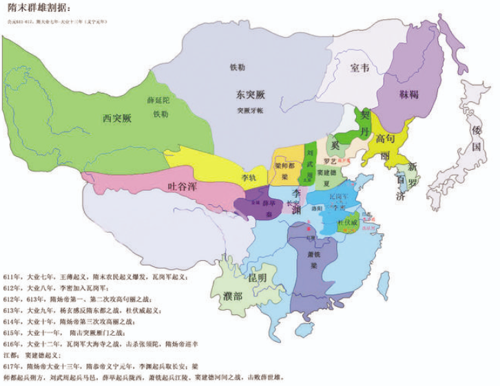 在始畢可汗的支持下,當(dāng)時(shí)有三大反隋勢(shì)力崛起,分別為西南的梁師都及其盟友、東北的竇建德及其盟友、北部的劉武周和李淵父子。
