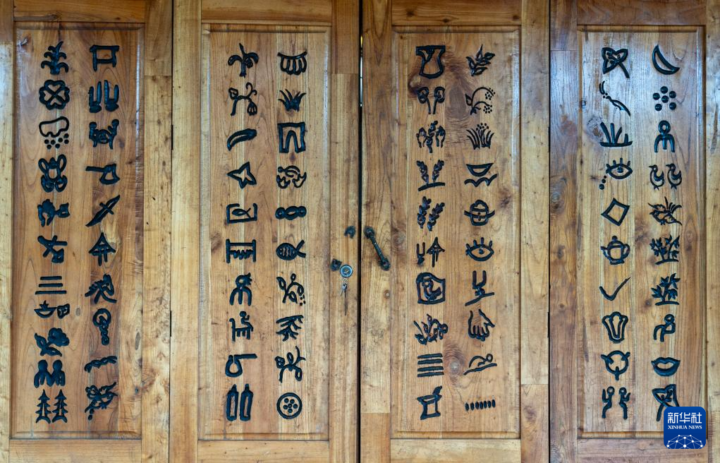 這是7月30日拍攝的刻在坡芽村坡芽傳習(xí)館門板上的81個“坡芽情歌”圖畫符號。