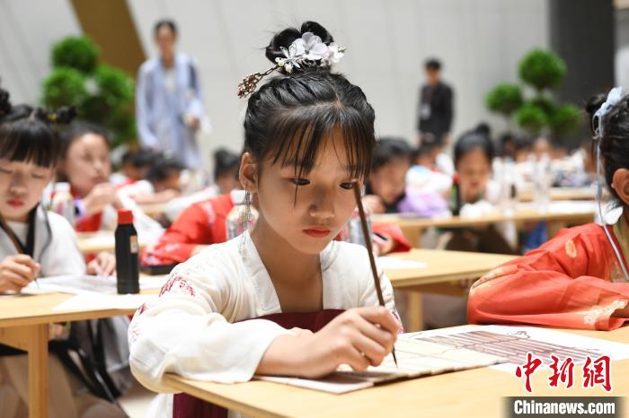 圖為9月7日,小朋友們在位于甘肅蘭州的甘肅簡牘博物館學(xué)習(xí)書寫簡牘中的文字。中新社記者 九美旦增 攝