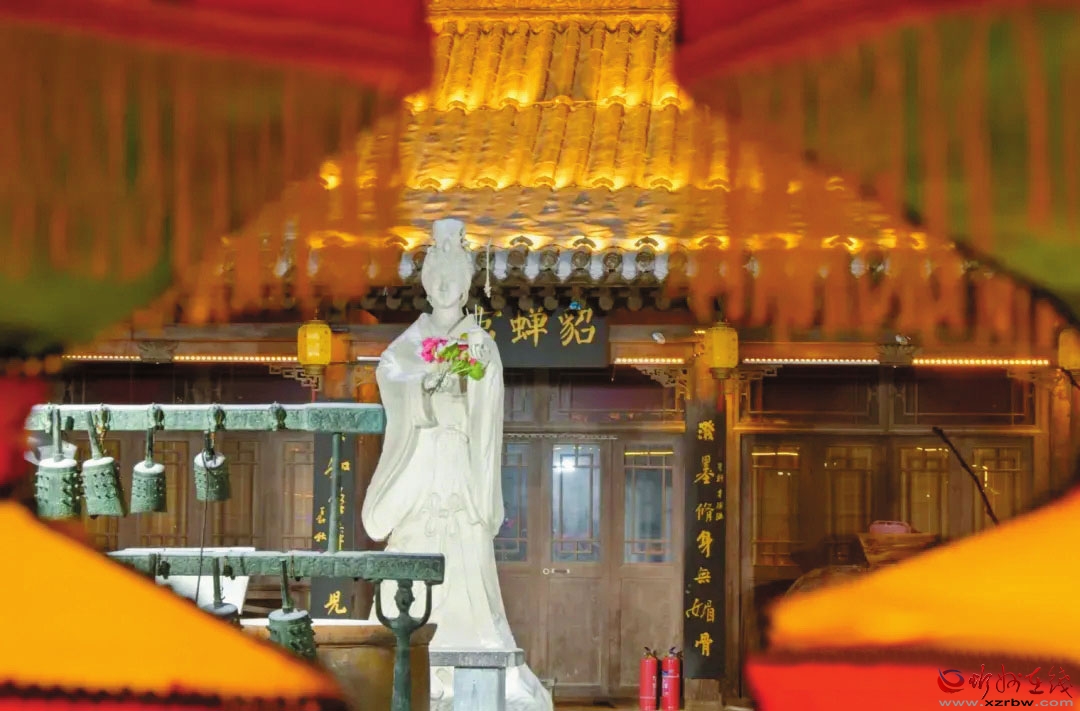 現(xiàn)在的貂蟬陵園是在墓地原址重新筑砌的,坐北朝南,門檐上懸“貂蟬陵園”橫匾,兩側(cè)有“閉月羞花堪為中國(guó)驕傲,忍辱步險(xiǎn)實(shí)令須眉仰止”的金文楹聯(lián)。園內(nèi)用花墻分隔成南、北兩部分,北為陵區(qū),南為展區(qū)。南院建貂蟬彩塑館,再現(xiàn)“貂蟬迎賓”“羞花問(wèn)世”“祭山驚艷”“落難認(rèn)父”“拜月銘志”“憂國(guó)請(qǐng)纓”“施計(jì)除奸”“繡袍寄情”等場(chǎng)面,反映了貂蟬“不惜萬(wàn)金軀,何懼險(xiǎn)象生”的一生。