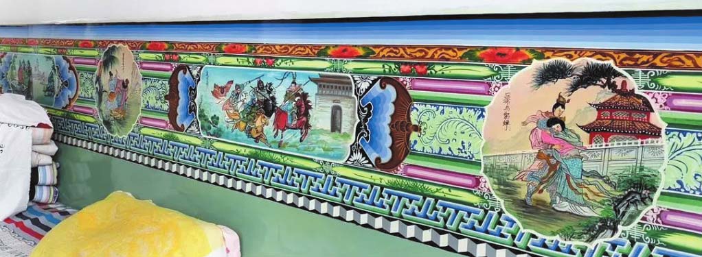 炕圍畫也叫墻圍畫,距今已有1200多年歷史,是原平人特有的“根脈性”藝術。手工藝人以墻為紙,將民族文化與當地生活、精神巧妙融合,造型藝術集壁畫、年畫和建筑彩繪于一體,定格于墻壁之上,代代相傳?!?7歲起,我就跟隨父親學習炕圍畫技藝,如今有60多年了?!惫M壽感慨道,“以前家家戶戶都會在炕邊畫炕圍畫。隨著時代變遷,人們住進了樓房,我們就把炕圍畫畫在紙上?!?/p>