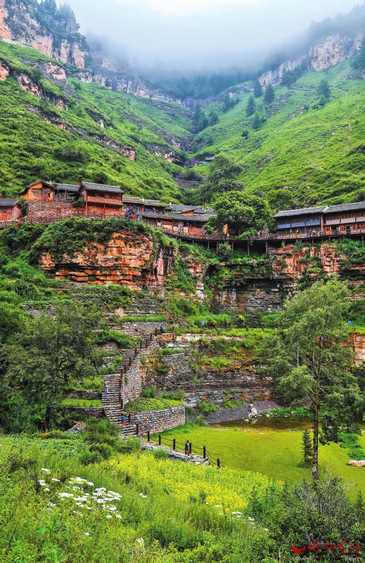 基巖構(gòu)造、河谷沖擊、垂直生態(tài)、冷涼氣候……有別于他處的雋永靈秀,寧武之境實(shí)乃神來(lái)之筆。懸空村位于寧武縣管涔山深處,現(xiàn)為蘆芽山風(fēng)景區(qū)的一個(gè)景點(diǎn),因村莊懸于峭壁之上而稱奇。村里多以石頭和木材建房,村中唯一道路是由圓木搭起的空中棧道,行于其上,猶如走在半空,從崖底仰望,似空中樓閣,故而得名。