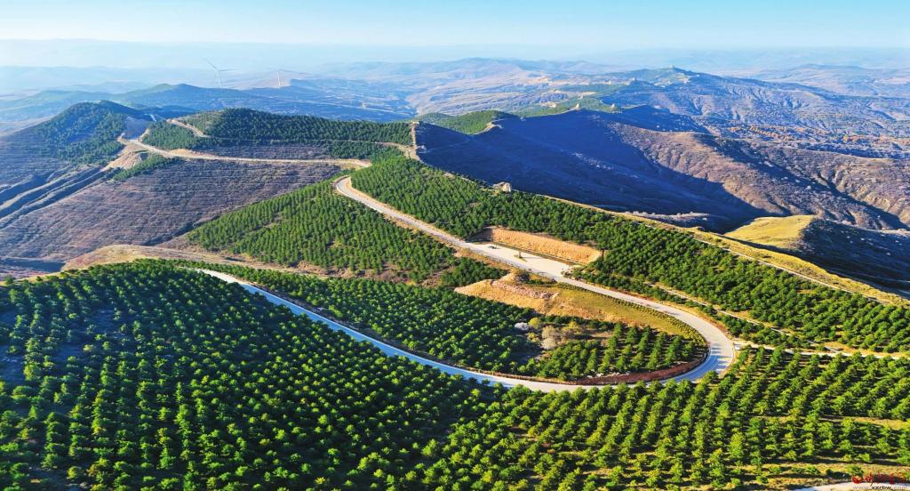邊塞重地,長年征戰(zhàn),風沙肆虐,溝壑縱橫。特殊的地理位置和惡劣的氣候條件,導致偏關的原始植被幾近絕跡。偏關人一年中有半年在植樹造林,人工搬苗,人工運水,從山下到山上,再從山上到山下,來回往返,汗水淌過春夏秋冬,足跡踏遍山嶺圪梁。為減少水土流失,他們在山坡上挖交錯排列的魚鱗坑,以貯存“貴如油”的雨水,為油松提供有限的囊盡天地之饋贈的水肥。淺淺的土層,種不下高頭大樹,僅能讓幾十厘米的油松保持直立。偏關人誓將“荒山”變“綠山”,“換書記不換主意,換縣長不換主張”“一任接著一任干,一級干給一級看”……以堅韌之力重塑山河、治理生態(tài),以愚公之力見縫插綠、逢山播綠,以“饅頭加镢頭、燴菜加會戰(zhàn)”的不屈精神,年年歲歲,綠色接力,將偏關打造成全省生態(tài)建設紅旗縣,黃河流域生態(tài)文明建設先進縣,在不毛之地寫下綠色詩行,筑起綠色長城。